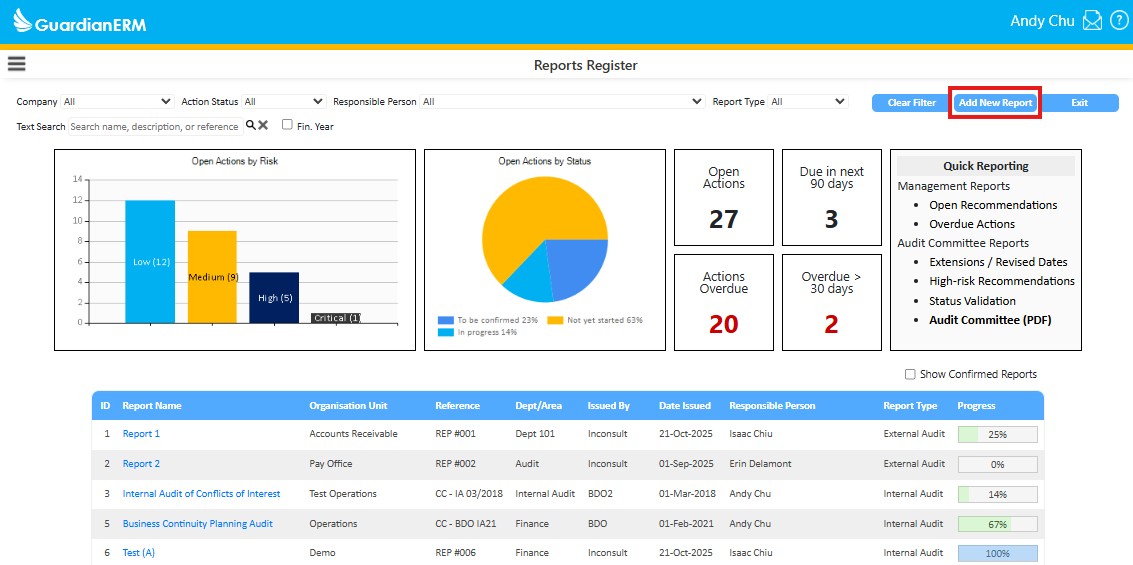 To start inputting actions into AuditDesk first select "Add New Report" at the top right of the screen:
