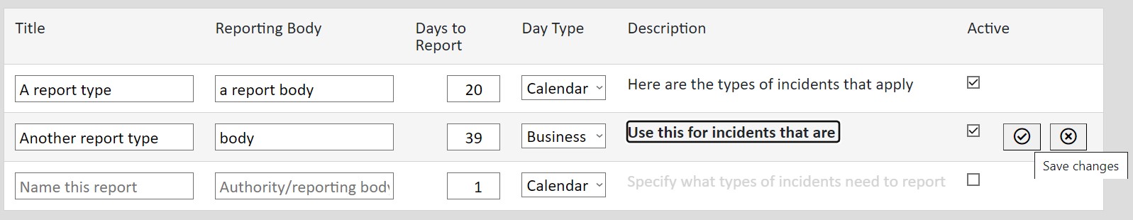 To add a new reporting type, click on the grey "Title" field of the line at the bottom of the list, and fill in all the required fields.
